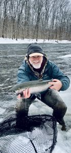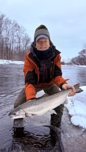 And, back to our regularly scheduled routine! A few fresh inches of snow, and temperatures staying just below 20 F most of the day, made for quite a delightful walk in the park. A few anglers joined us early this morning, one season pass holder making quick work of things, out by the early afternoon. One of our lodge guests opted to head up river after his success late yesterday down here on the run, indicating another 4 fish upriver to add to his 3 late yesterday afternoon. River conditions this morning were slushy, carrying on for most of the day today down here on the bottom end of the river. We expect a bit more of the same tomorrow. Tonight with a low of 17F, but tomorrow, the wind is going to biggest hitch in the giddy up. Forecasts call for winds 25-30 MPH with gusts of 40F. Hold onto your hats! With overnight forecasts, and impending weather tomorrow, DSR will have a delayed opening tomorrow 2/19/22, Opening 9:00 AM.