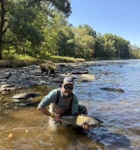 Third picture: Jon fishing with Christian from NYGUIDESERVICE LANDS A 12 POUND BROWN ON A PURPLE WOLLY BUGGER 9/28/25