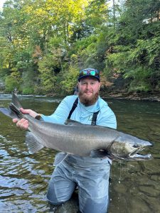 3 OCT 25: The Manor House guests' reserved areas are both CLOSED all day today, to our other guests, until further notice; any updates will be published immediately through here, our website fishing reports, through Guest Services at the Welcome Center, and through the River Patrol assigned to the two specific reserved areas. Appropriate signage has also been posted at the boundaries of these two areas, to indicate whether the areas are accessible. The flow from the dam is scheduled to remain at 185 CFS until 10/03/2025 11:59 PM. The CFS at the Pineville gauge is currently 195. The estuary section reported moderate guest density with moderate angling success. Multiple Kings and Coho salmon being reported as moving upriver. The lower section reported moderate guest density along with good success with a mixture of Kings, Coho, and Brown Trout. Most of the fish were seen holding in pools with a few moving upriver. The middle section reported moderate guest density throughout, experiencing good fishing activity with Kings, Coho, and a few Steelhead. Fish were seen holding in pools as well as moving upriver. The upper section reported high guest density and good – excellent angling success with multiple Kings and Coho being brought to hand. Fish were observed as moving upriver quickly. The top section reported no guests present. Pictured below is Ryan (Guided by DSR Guide Larry Gonzalez of "Larry’s Fishing Charters ") with a trophy sized Coho salmon!