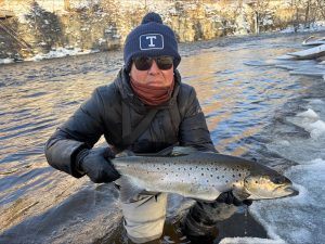 12/05/2025 DSR Full-day Fishing Report: The current dam release is 750 CFS, where it is projected to remain until 12/06/2025 11:59 PM. The CFS at the Pineville gauge is currently 971 as of 4:30 PM. A handful of guests joined us on the run today. The upper section seemed to fish the best, with Steelhead and Brown trout being the species reported. A few guests stated that they landed or hooked one or two Steelhead as well as one Brown in the mix. Featured today is David with a beautiful Brown trout. He was guided by DSR guide Mike Ford of “Reel Addicted Charters & Guide Service”. The forecast for tonight is: “Partly cloudy this evening, then becoming cloudy after midnight. Low 17F. Winds SSE at 5 to 10 mph.” The forecast for tomorrow is: “Cloudy with snow developing during the afternoon. High 34F. Winds SSW at 10 to 15 mph. Chance of snow 70%. Snow accumulations less than one inch.”